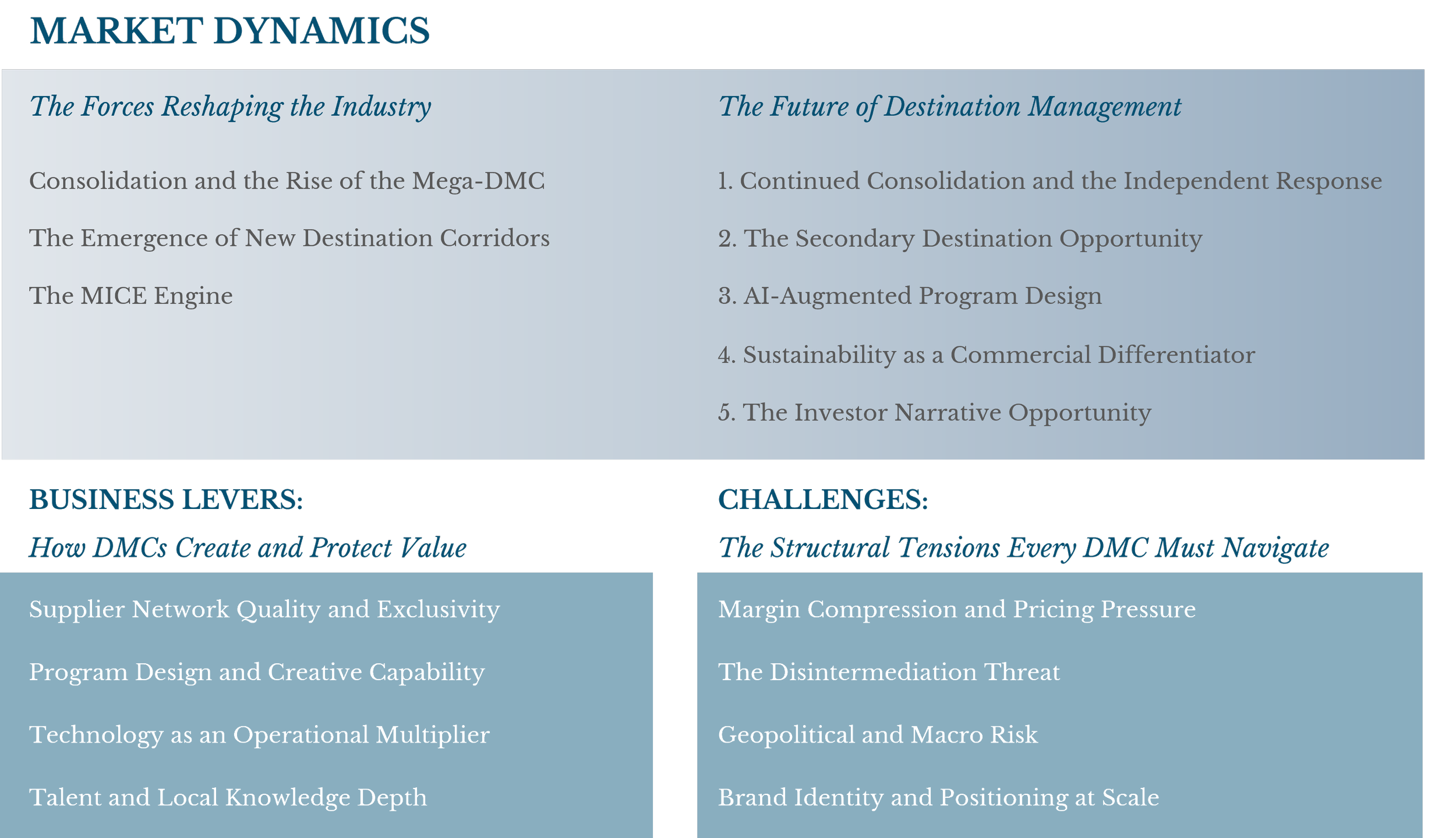 DMCs are not a legacy category threatened by disruption. They are a structurally resilient service model whose core value (deep local expertise, trusted supplier networks, and human orchestration of complex experiences) is becoming more rather than less relevant as the world becomes simultaneously more connected and more complex.