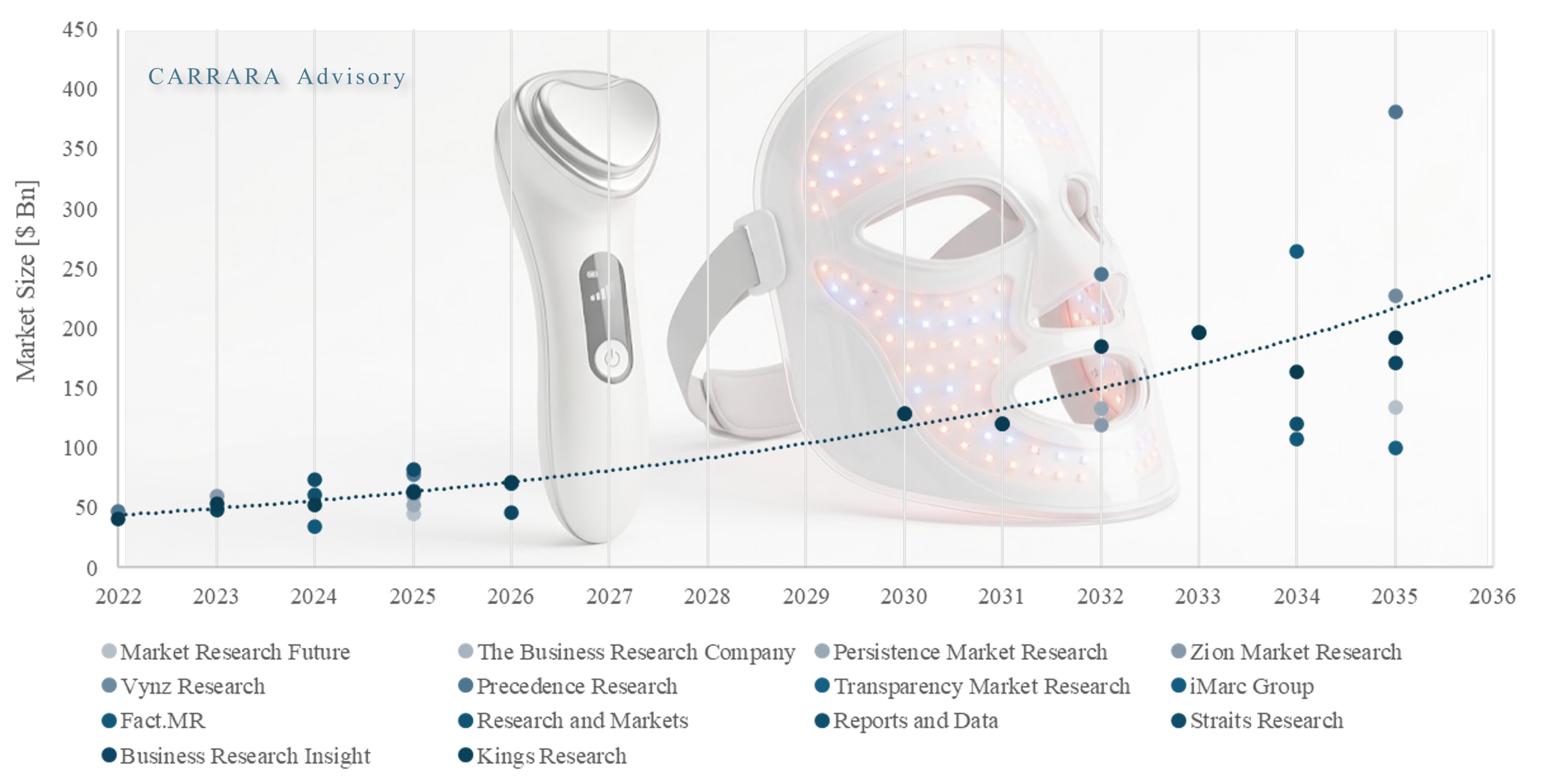 Based on the cross-source dataset, the 2025 global beauty tech devices market sits within a corridor of $45 billion to $82 billion, with a practical midpoint of $63.5 billion. The more important question, however, is whether beauty devices remain a premium hardware adjacency or evolve into the operating layer of modern beauty ecosystems. That distinction drives radically different market outcomes through 2035.