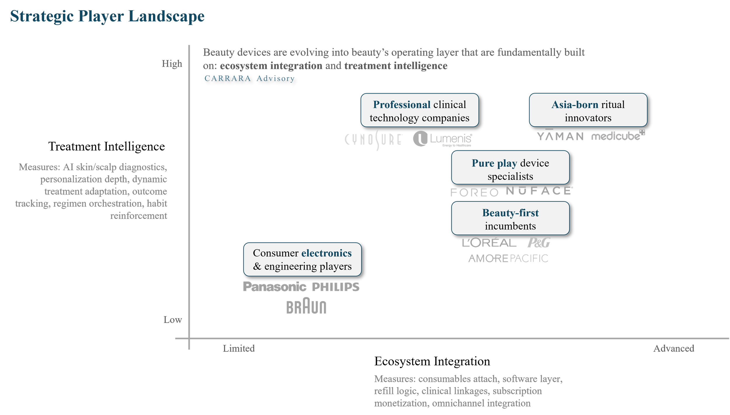 The beauty tech devices market is best understood through the interaction of three layers: segment economics, player archetypes, and future value creation paths.