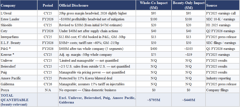 The table below aggregates official disclosures across fourteen companies, distinguishing between whole-company tariff impacts and beauty-relevant pro-rata allocations. For pure-play beauty companies the two figures are identical. For P&G, the $400 million after-tax whole-company figure has been allocated to beauty using actual segment revenues: P&G Beauty plus Grooming contributed $21.6 billion, or 25.7% of total group revenues, implying a beauty-attributable tariff cost of approximately $103 million. For Kenvue, the same methodology applied to the Skin Health and Beauty segment (approximately $3.9 billion, or 25.7% of group revenues) yields a pro-rata figure of approximately $19 million.