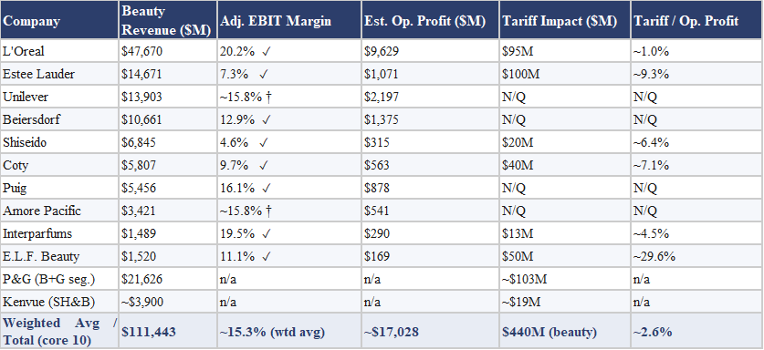 Absolute dollar figures tell only part of the story. To understand the true severity of tariff exposure, the impact must be measured against each company's profit base. The table below sets the tariff burden against adjusted EBIT margins and estimated operating profits. Where a company-specific beauty EBIT margin could not be confirmed from official disclosures, we apply the industry average of 15.8% as a proxy, flagged with a dagger symbol.