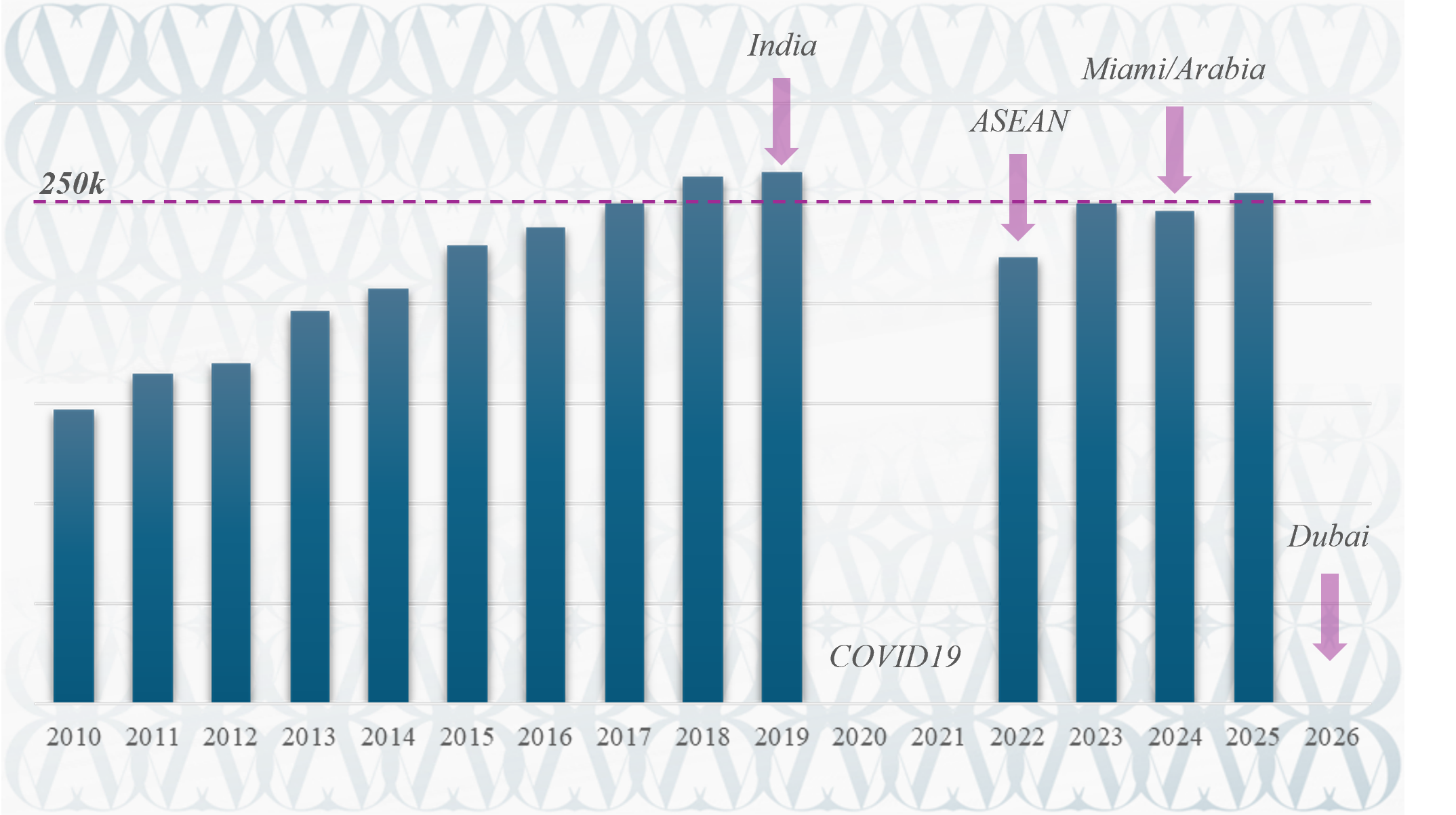 The natural question is whether this geographic expansion creates any dilution of the central event. The evidence on aggregate attendance suggests the effect has so far been limited: Bologna's visitor count in 2025 was broadly in line with its 2019 peak, and the 2026 edition drew well above 250,000 visitors. The new editions appear to be primarily capturing local demand that would not have traveled to Italy in any case, rather than cannibalizing the Bologna audience. An Indian brand manager attending Cosmoprof Mumbai may never have attended Bologna at all; a European buyer who attends Bologna rarely substitutes it with Bangkok.