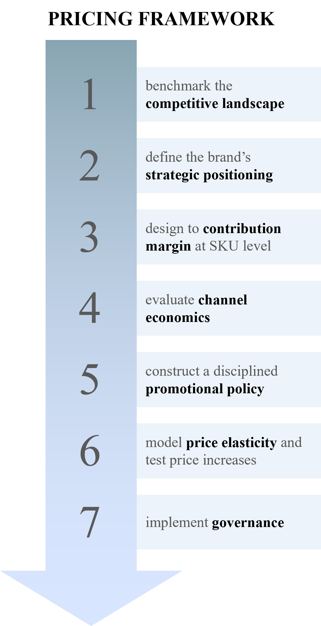1. Benchmark the competitive landscape. This does not mean copying competitors but understanding the price signals in each subcategory. Benchmarking should highlight where the brand is underpriced or overpriced relative to its promise.